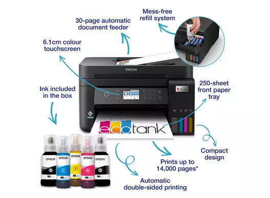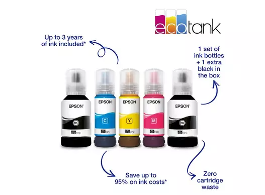 - Simple hassle-free ink tank system lets you refill from bottles Plus the EcoTank key-lock bottle system ensures it’s mess-free too